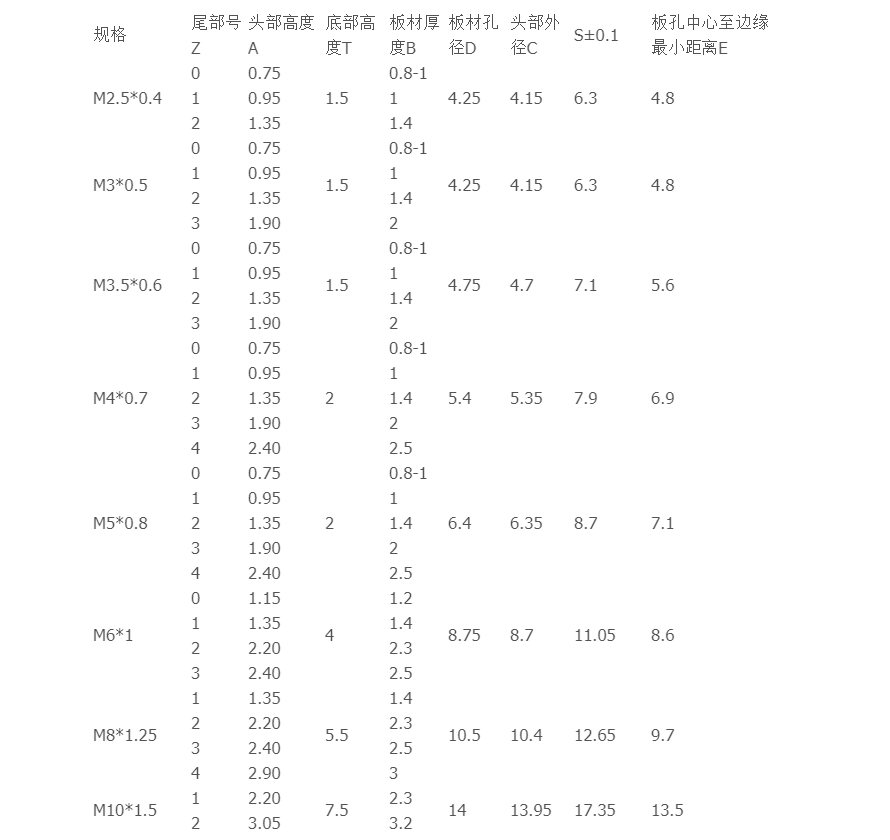 壓鉚螺母屬性參數(shù)表
